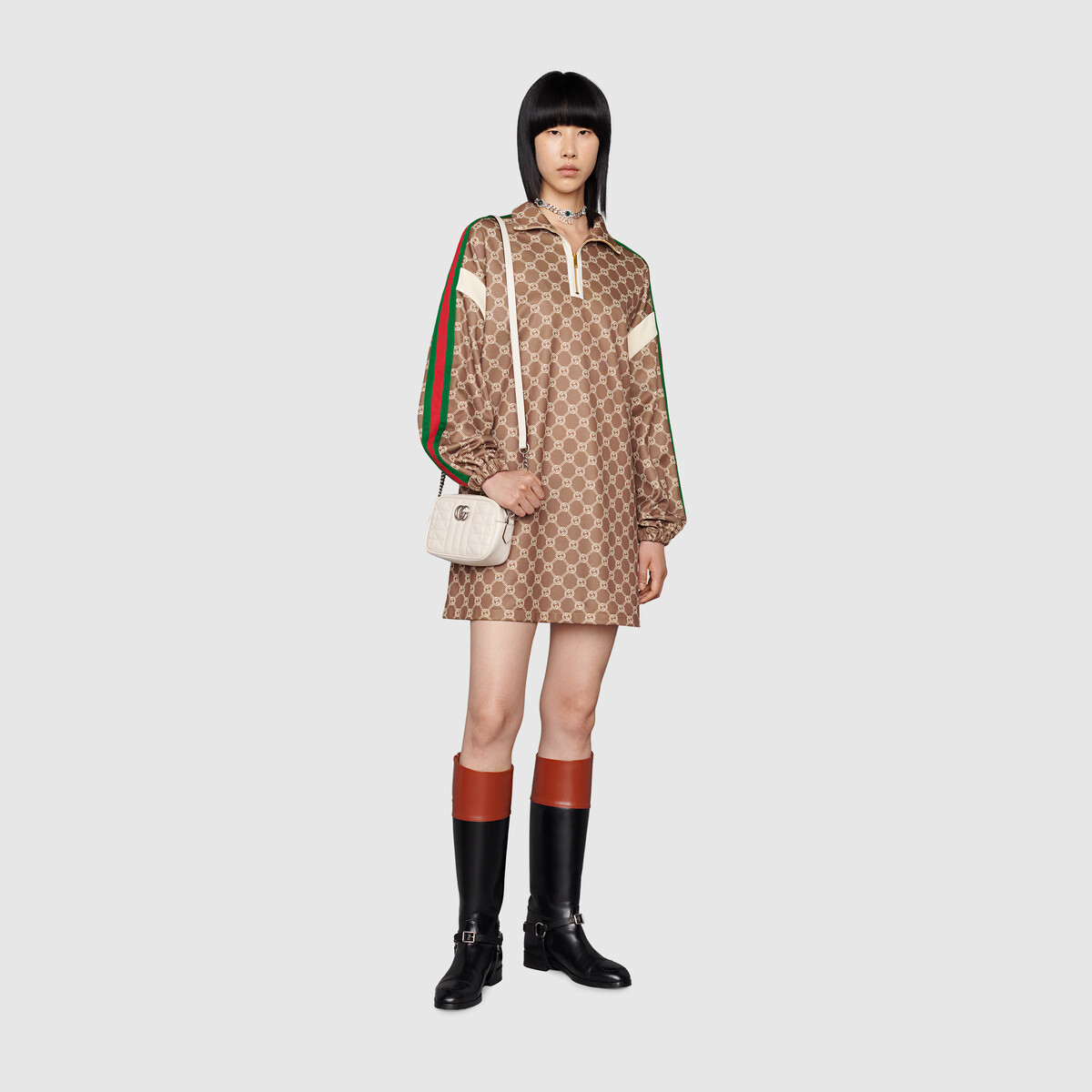 The GG Marmont is characterized by the brand's emblematic monogram hardware and matelassé leather. For The Gucci Aria collection, the style is reimagined with a new geometric approach to the signature material while its Double G hardware is presented with an antique silver-toned finish. The design appears here in the shape of a small shoulder bag in white.