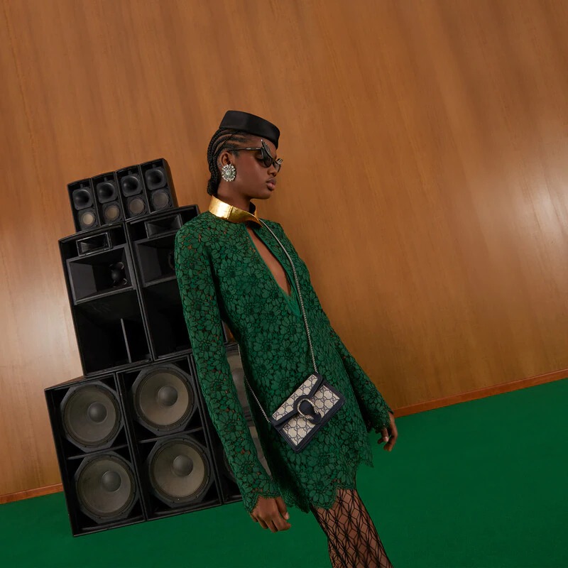 Mirroring the material's historic origins, GG Supreme is introduced in a timeless mix of blue and beige for Gucci Love Parade. The canvas has come to the front of each collection decade after decade to become a hallmark of the House. Here, the classic palette defines this Dionysus super mini bag.